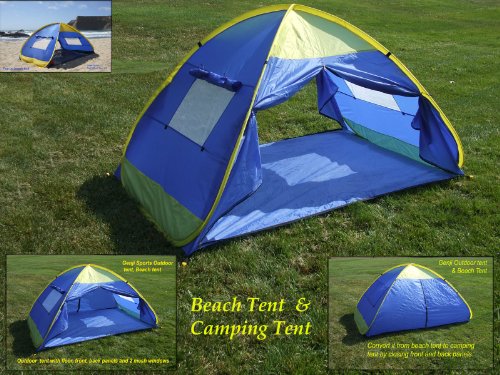 Self expanded outdoor tent auto pop opened in one second, easily folded down in 3 seconds. Packed in a 22-Inch carrying shoulder bag. Light weigh, easy to carry, suitable for beach, park and outdoor activities. Durable T190 nylon UV protected nylon (50+ UPF) rating on 4 sides of tent, flame retardant nylon meet CPAI-84 standard. Zippers back and front panels, 2 large side screen windows allow fresh air to breezes through, both windows come with roll up cover. This self erecting tent is an excellent outdoor must have equipment to carry to all outdoor activities, specially for the family with baby and children, it can prevent youngster over exposed under the sun and give parent a nice relaxing shelter to read or take a nap.This family outdoor tent has front and rear zipper panels, not only can be used as beach tent but also be used on camping and outdoor activities. An optional beach tent waterproof fly is available, it converts beach tent into a standard camping tent in seconds. The special designed water proof cover equip with zipper, ventilation windows and 4 ground stakes can be purchase separately. Self expanded outdoor tent specifications self expanded in one second, folds down in 3 second, 4sides and floor are made from durable T190 nylon cloth, UV protective coating rating 50 + UPF, flame resistance nylon meets CPAI-84 standard. 2 side screen windows with roll up cover. Fully opened zipper back and front panels. Strong steel beam frame covered by 600D Oxford nylon, light weight and durable. Comes with 4 plastic ground stakes, sand bags pockets on both side panels. Full size carrying case with shoulder strap. Tent dimension: 210 x132 x128-Centimeter (length x width x height) or 82.7 x 52 x 50-Inch (length x width x height). Large enough for two adults or one adult and many kids. Weight 5-Pounds 4-Ounce.If you're looking for an easy-to-assemble family tent for the beach, park, or even a warm-weather campsite, you've found it in the Pop Up Outdoor Family Tent from Genji Sports. It automatically pops up and open in 1 second and folds back down in only 3 seconds. It's super lightweight at only five pounds and is easily carried to the beach, park, and campground. It has front and rear zipper panels, two side screen windows with roll-up cover, and a strong steel beam frame that's lightweight and durable. The flame resistant nylon fabric has a UV rating of 50+ UPF to protect you and your family from the sun's harmful rays. It comes with four plastic ground stakes, sand bag pockets on both side panels, and a full-size carrying case with shoulder strap.