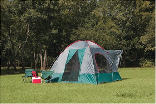 Constructed of light and strong nylon taffeta with a durable water-resistant polyethylene floor that is easy to clean, the tent is built to last for generations of fun. The rainfly is equipped with an awning for additional weather protection, and the tent is equipped with a large T-style door, a backdoor, and two windows with no see-um mesh for protected ventilation.